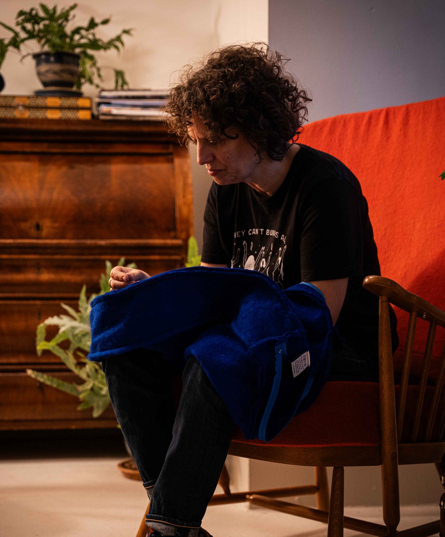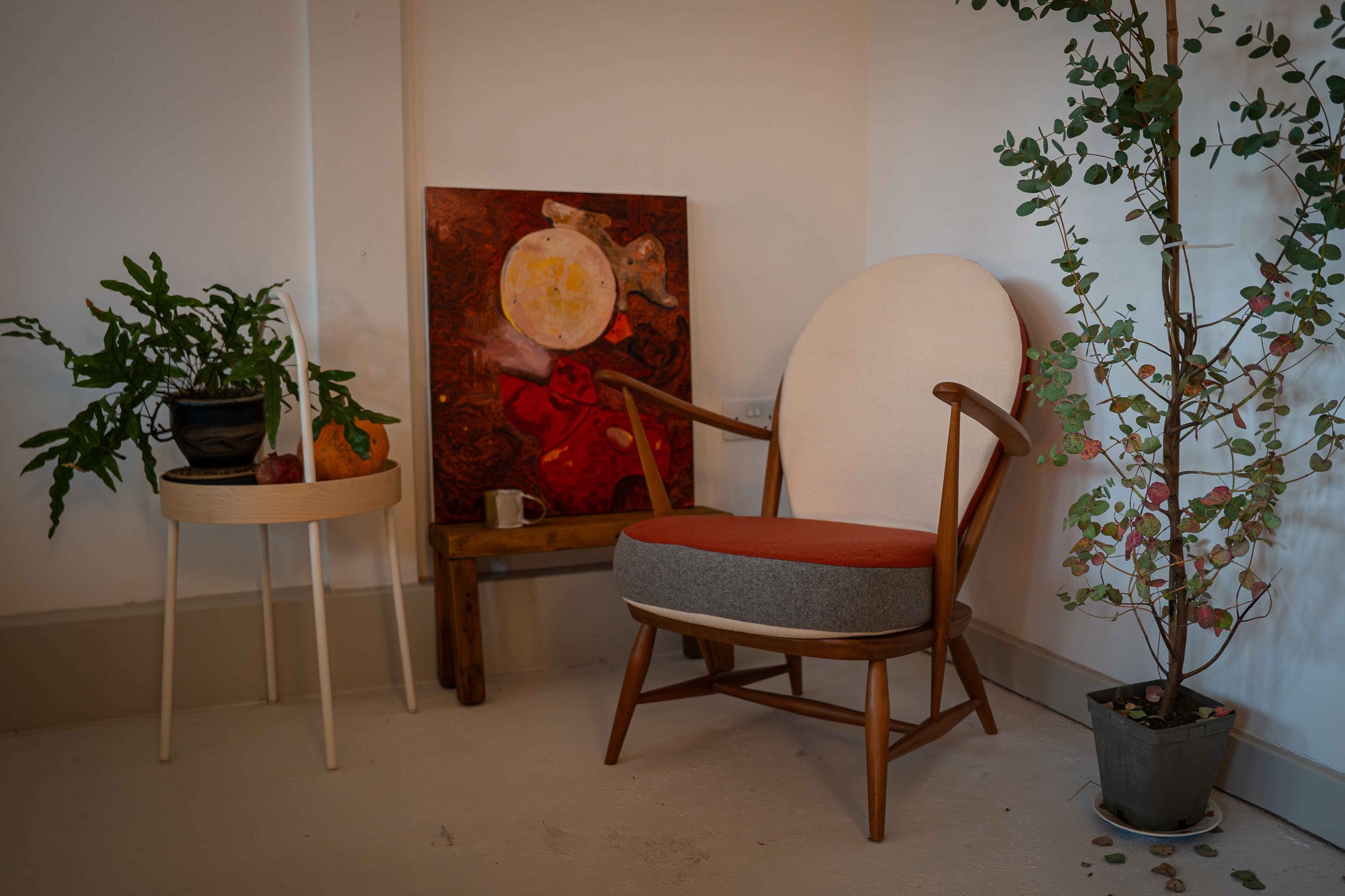 The upholstery is made from hand-dyed vintage woollen blankets and Welsh tapestry fabric from a small mill in Pembrokeshire.