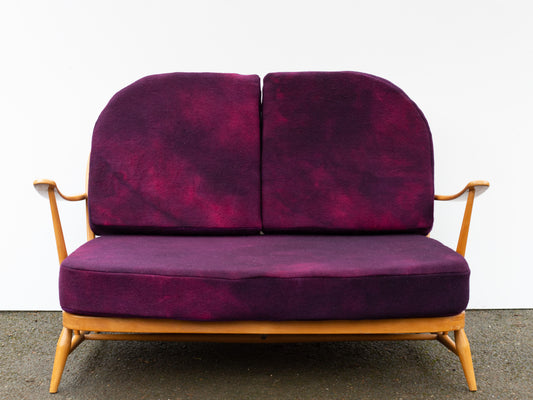 A selection of original Ercol armchairs & sofas, restored ready for delivery. Cushion covers made from vintage wool blankets, Hand-dyed or traditional woven Welsh Tapestry.
