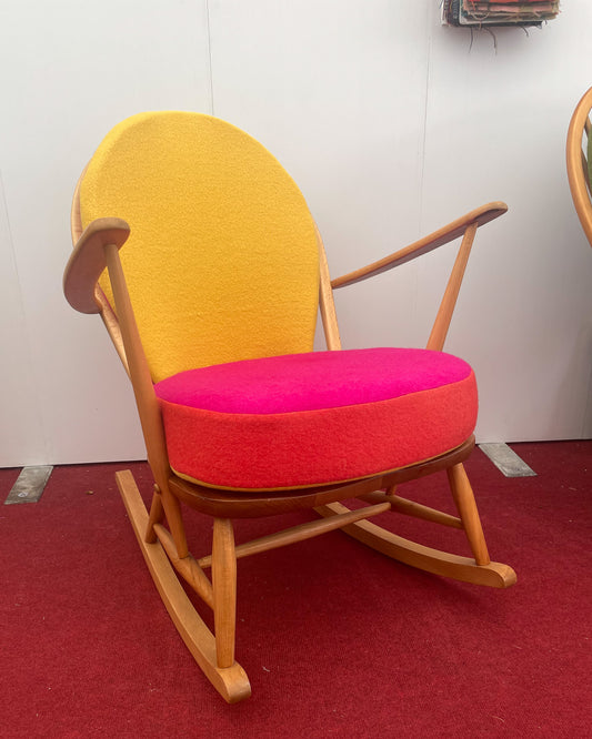Trio Colour Block - Ercol Windsor Blonde 470 Rocking Chair - Hot Pink, Lemon Yellow and Orange
