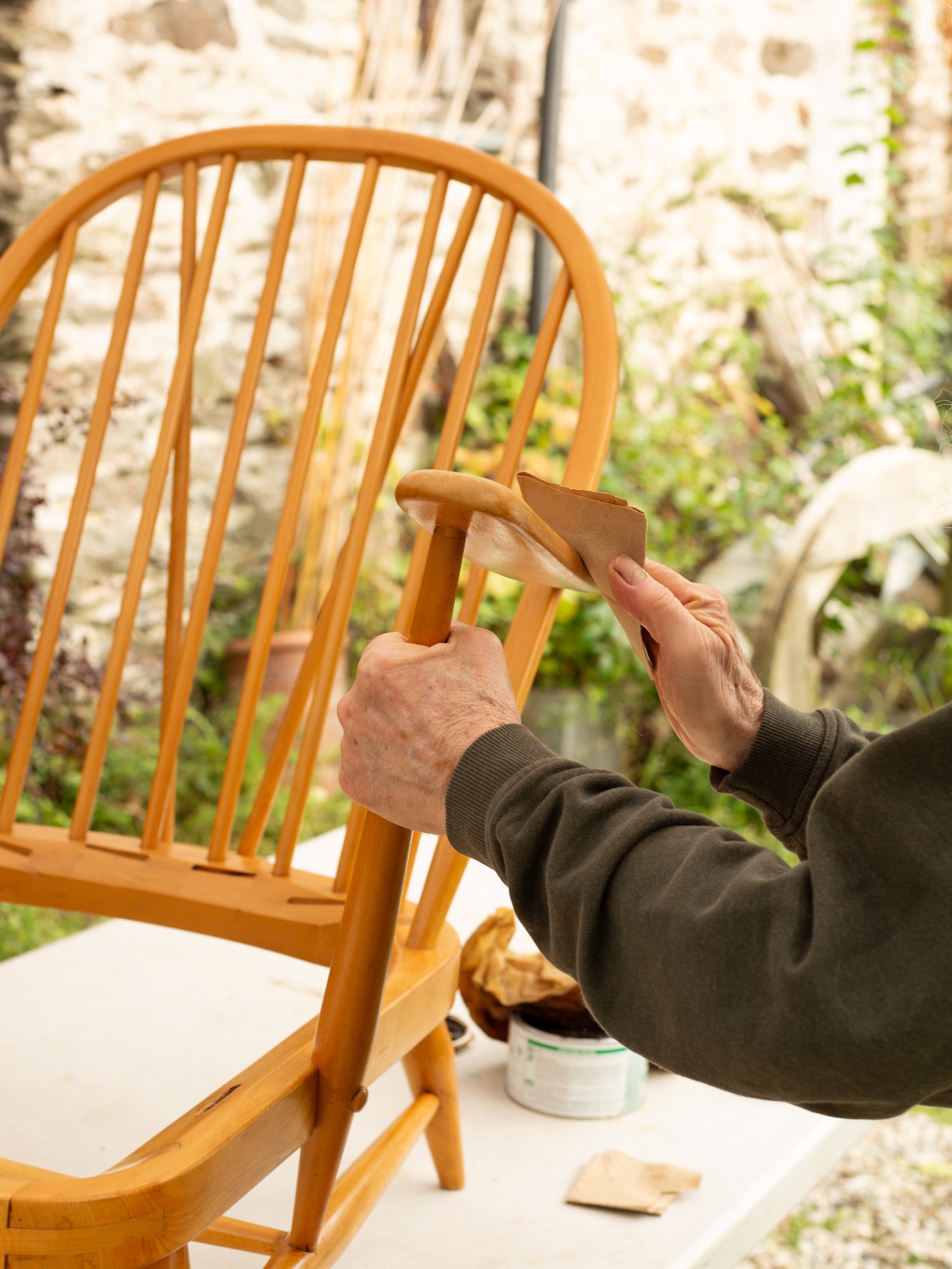 Here's a photo of Dad, sanding back one of our Made to Order 203 Ercol armchairs.