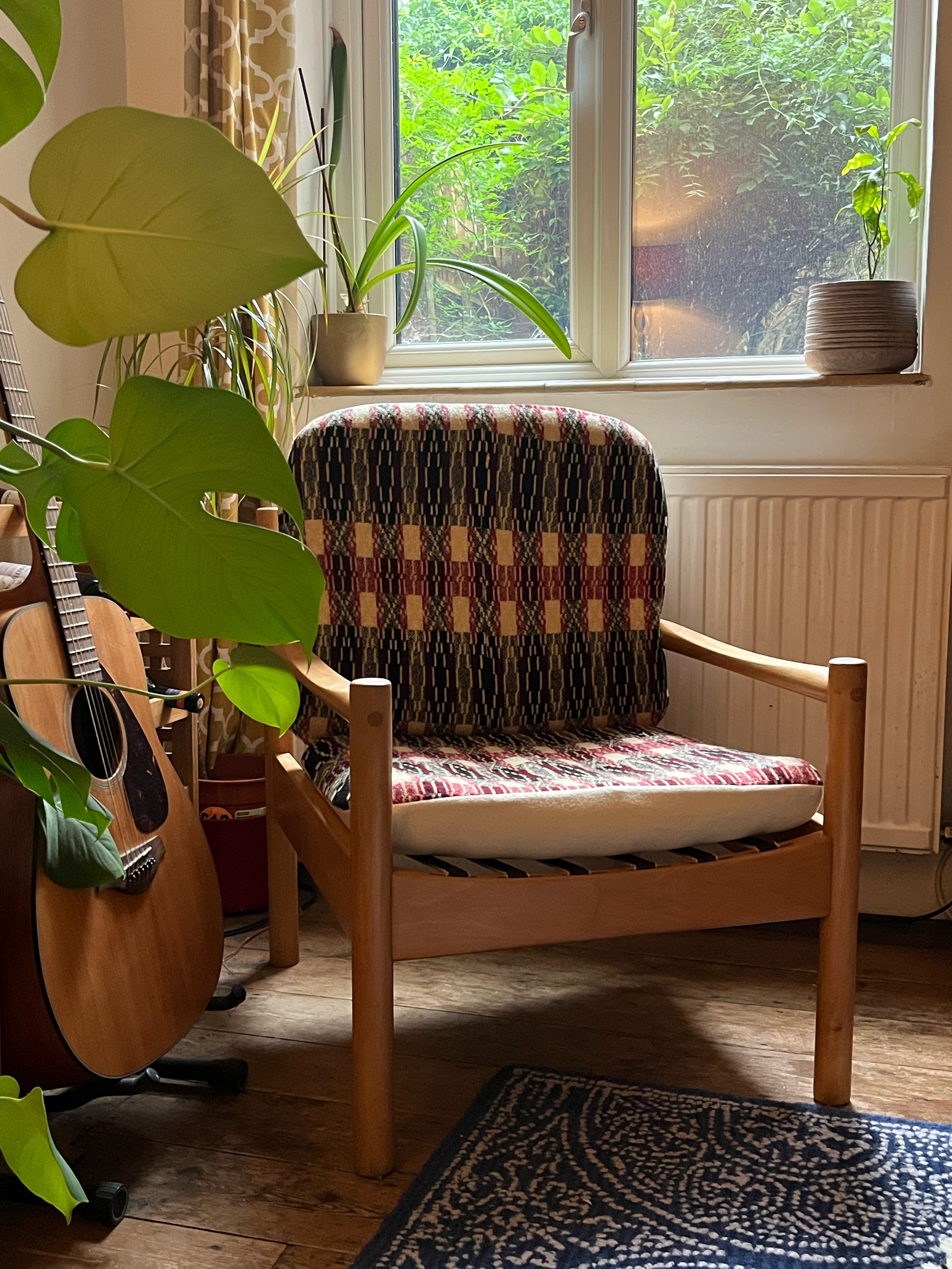"I fell in love with this chair instantly when I saw it at WOMAD festival. It took me by surprise as I wasn’t really looking to buy anything, but I am so happy I did. I now have such a unique piece which means so much to me. Once it arrived home it has become an essential part of my space and it’s also so comfortable! I like it for quiet moments and reading on weekend mornings."Alex, Oxford. Oct 24.