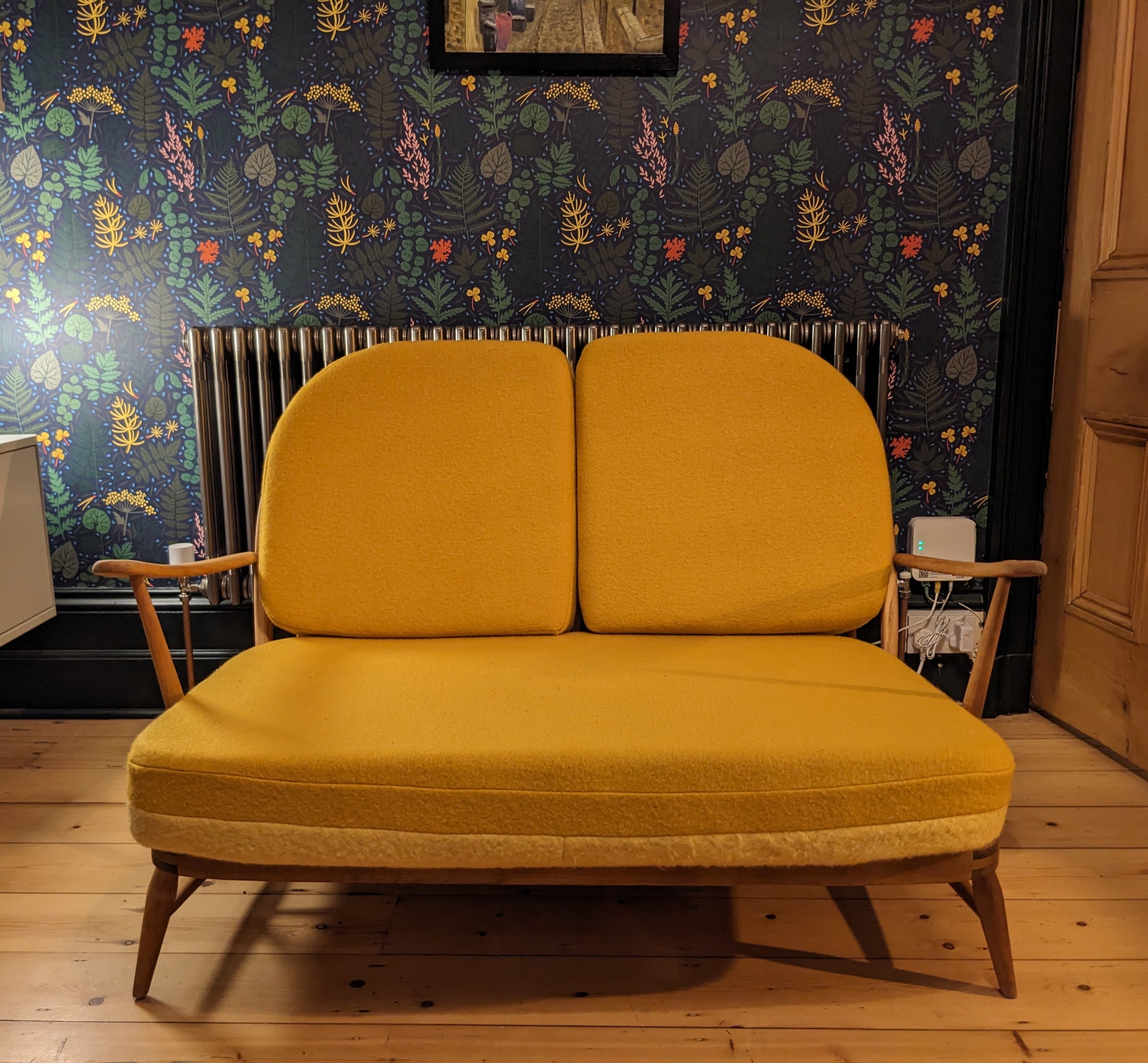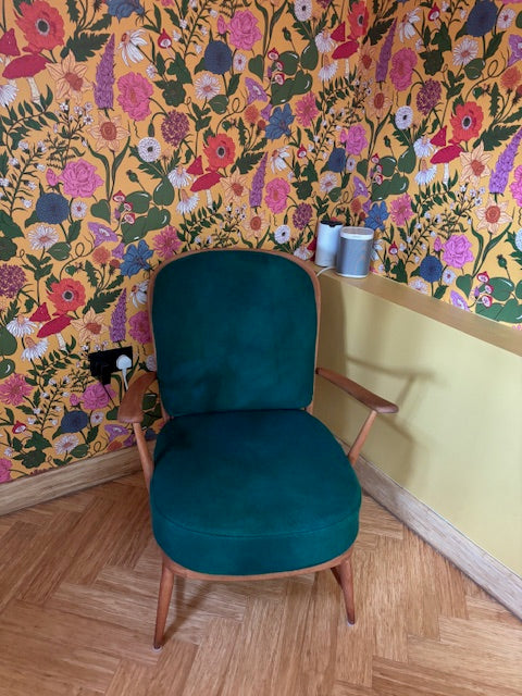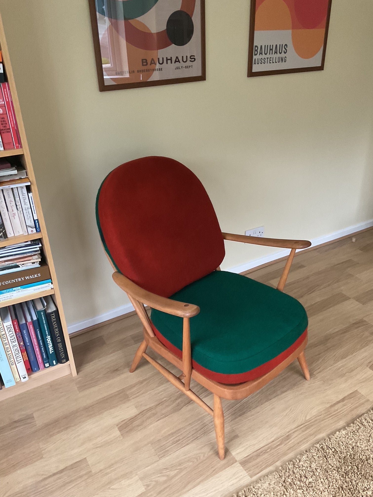 "Life goals... I've just fulfilled another! When we used to visit my godmother's house, in the 1950s and 1960s, I would eagerly read her Good Housekeeping magazine, even as a small child, poring over the fashions, the hairstyles and the furnishings. I particularly loved Ercol furniture, and would search the magazine each month for the adverts, and for any home styling articles that featured it.Well, now I own my very own piece of vintage Ercol. When I was at the End of the Road festival a few weeks ago, I met a woman who sources and restores the chairs and sofas. We sat on the chairs - I tried them all for size and comfort while we chatted about the processes and colour choices - and I ordered one. And here it is!!"Liz - Oldham Oct 24.