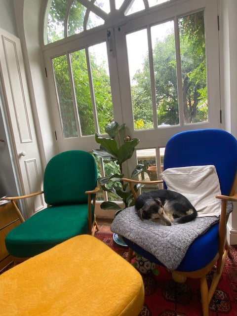 "We love these reconditioned and upholstered Ercol chairs from Emily at the Fields. We found her at her stand at a Festival so plenty of time to try them out. We were able to choose covers of any colour. They were dyed to order and are super comfortable and washable. Everyone wants to sit in these chairs in the cosy corner of the kitchen and put their feet up but Woody is always there first"Jo, London. July 24.