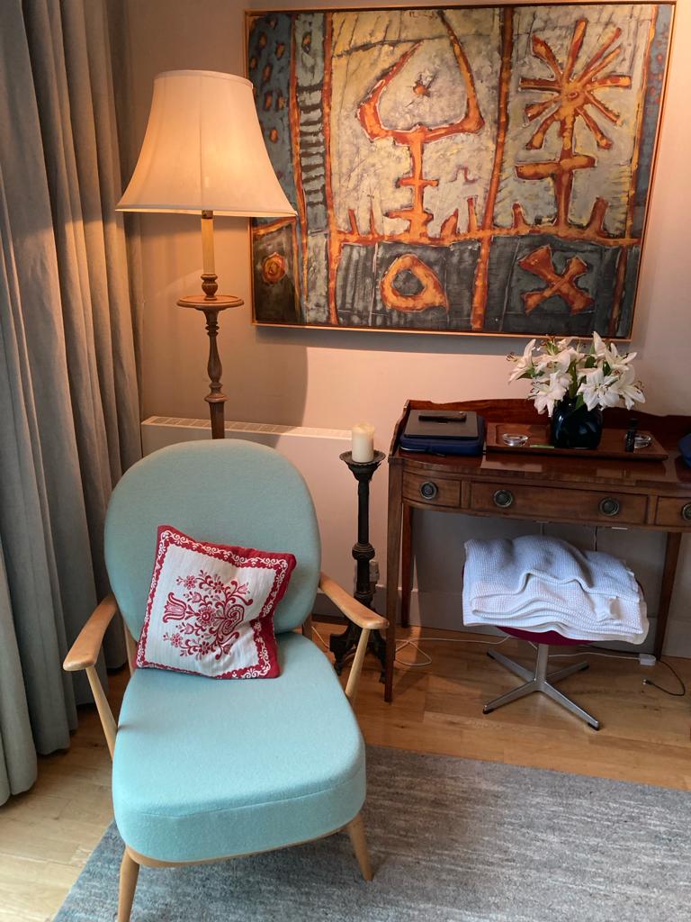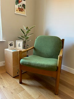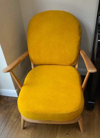 "Sitting in our chair for the first time in the vintage market, I knew straight away we had to have it - it is SO comfy, like being enveloped in a cloud! Emily and the team at Fields were so helpful, helping us with measurements so that we could choose the exact chair we wanted. They talked us through all the colour options, and made us the most beautiful yellow wool cushions for both the chair and footrest. We love them, they liven up our sitting room, bringing comfort and colour."Milla,Bethnal Green. July 24.
