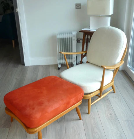 "We are delighted with the restored 204 and new two tone cushions - they add a great pop of colour which we are already ‘mix and matching’. Thanks especially to Emily for her time and patience guiding us through the subtle differences between different Ercol chair models! Ordering and delivery went like clockwork. Now looking forward to the just ordered stool cushion in same colours!”