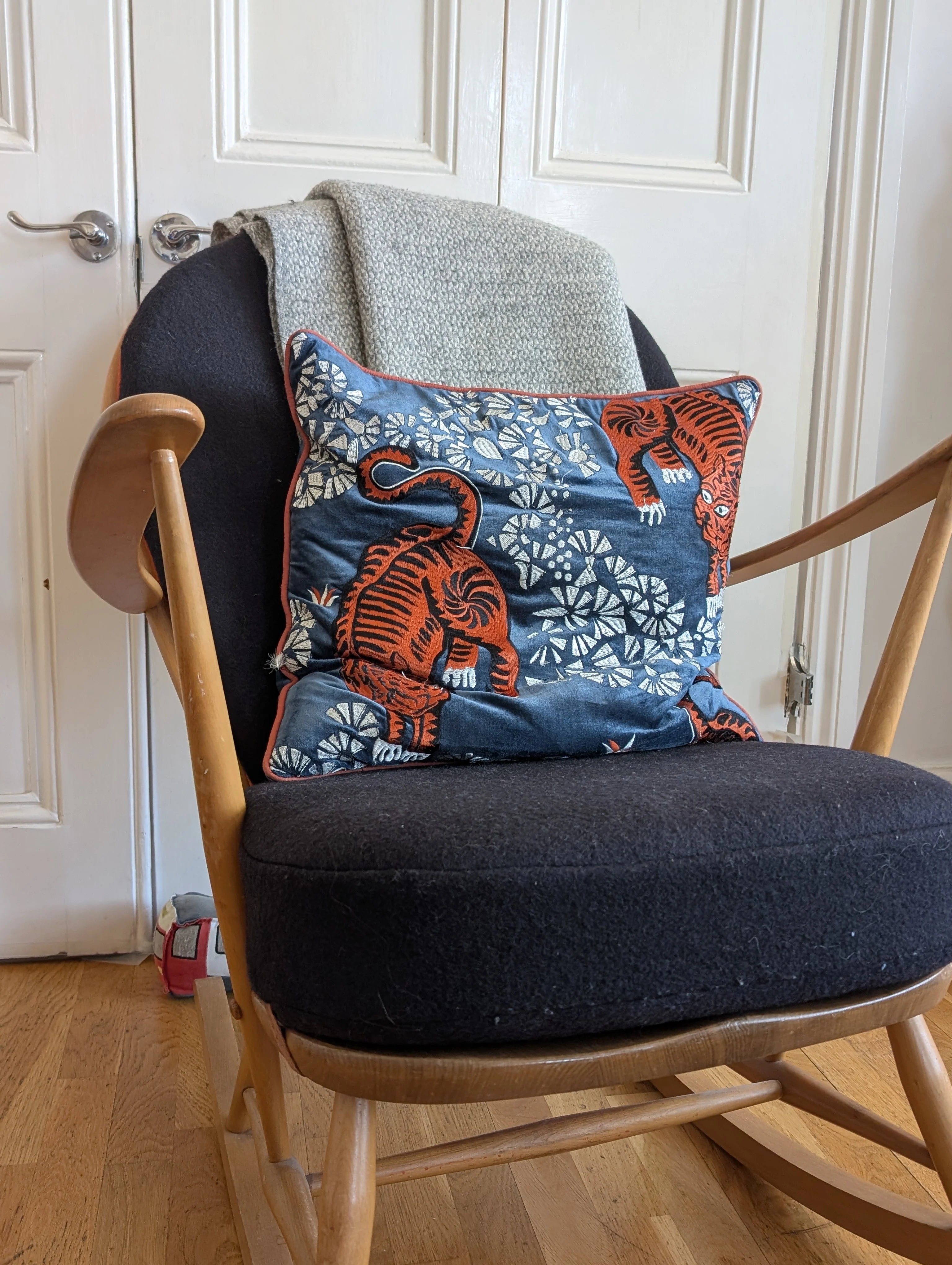 "We luckily chanced upon Emily's stall as we were debating selling on our old Ercol rocking chair as the cushions had gone and we couldn't use it comfortably.Emily ran us through colour options and once we'd settled on a choice she made us some lovely replacements that fit perfectly and look the part. Seat is now super comfortable and the wool fabric makes for a cosy seat. Very pleased with the result."