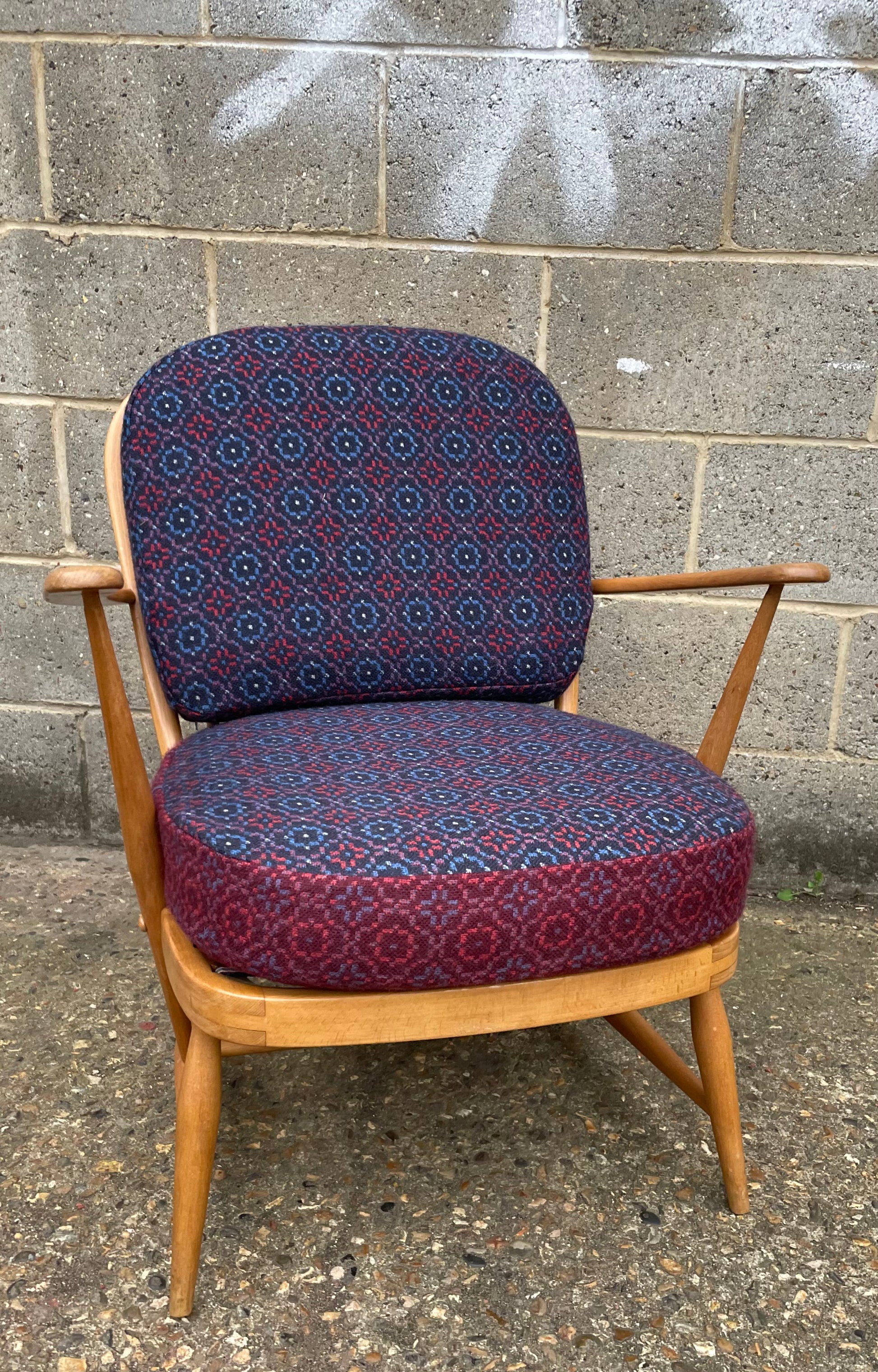 Upholstered using Melin Tregwynt 'Vintage Rose' a combo of Berry & Bilberry. This classic design is a hard wearing upholstery fabric, suitable for domestic or commercial use.